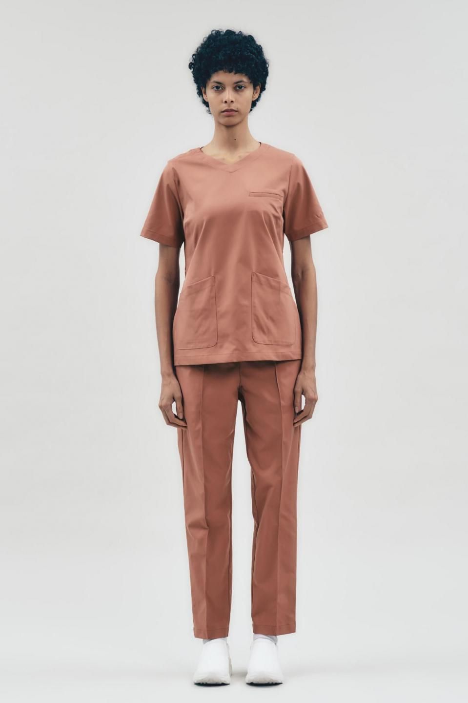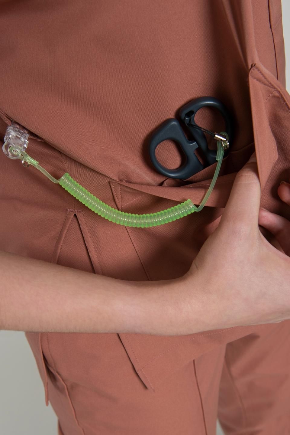タイトなパターンながらもボディラインがより美しく見えるように、ストレッチ性の高い生地を採用し快適な着心地を実現しました。撥水加工を施しているので、汚れにも強く、二重ポケットやストラップループといった機能面も拡充しています。ご自宅で洗濯出来るので、お手入れも簡単です。